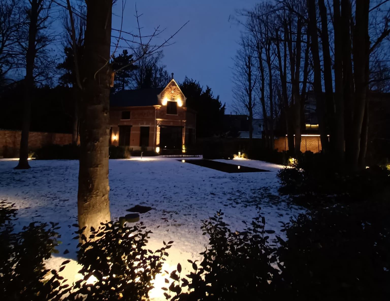 Sous un doux manteau de neige, le jardin de De Heerenhuizen s’anime complètement à la tombée de la nuit. Grâce à un éclairage d’ambiance qui met subtilement en valeur les chemins et les plantes, une atmosphère hivernale magique prend forme.